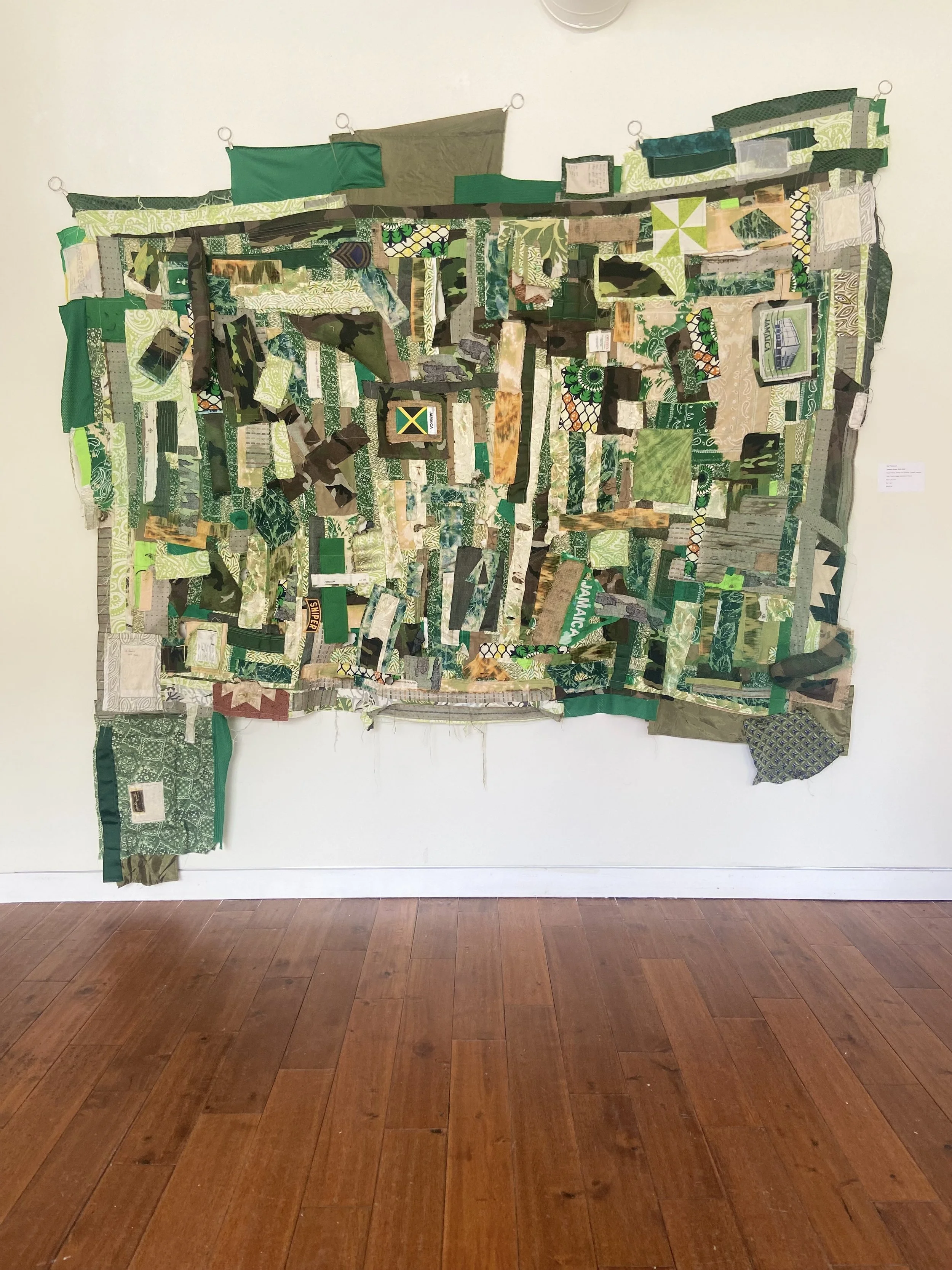 She uses personal and found materials to tell stories of migration, memory, and belonging. She consciously engages with her Jamaican heritage as both source and subject. At the Artist Talk, Kat spoke about how reclaiming her Jamaican identity through art means more than representation. She discussed how her family chose to assimilate deeply into mainstream American culture, leaving her feeling disconnected from both her Jamaican heritage, and Black American culture. Her use of textile fragments inspired by Jamaican craft and color palettes and family photos become conduits of memory, and form a sort of love letter to her parents reaffirming their Jamaican roots.